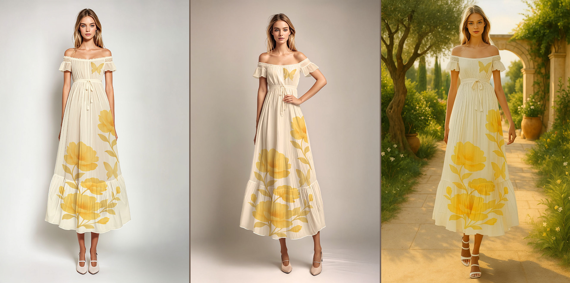 Three visualization styles, each with a purpose: Studio for clean reviews and line sheets, Lookbook for editorial storytelling, and Campaign for lifestyle marketing and launches.