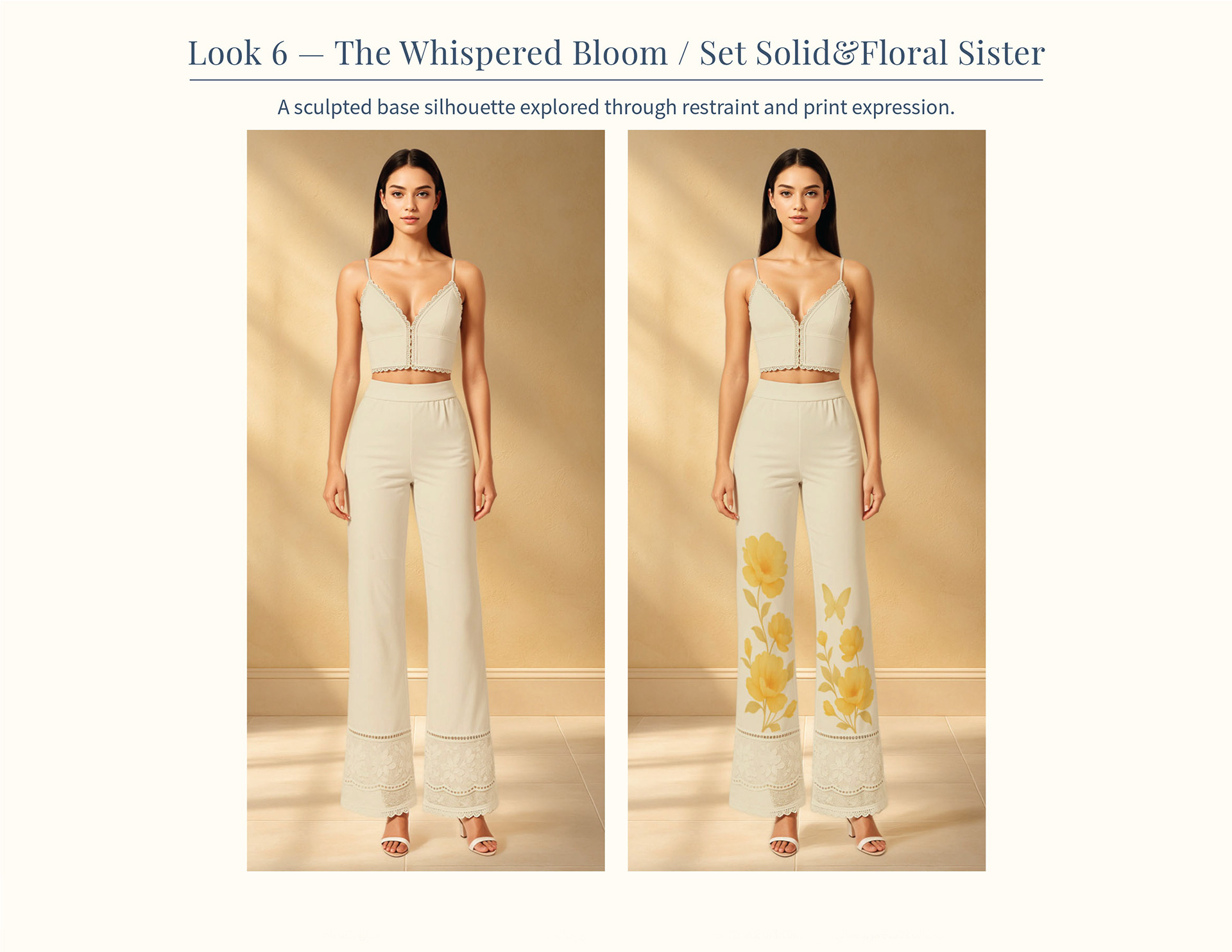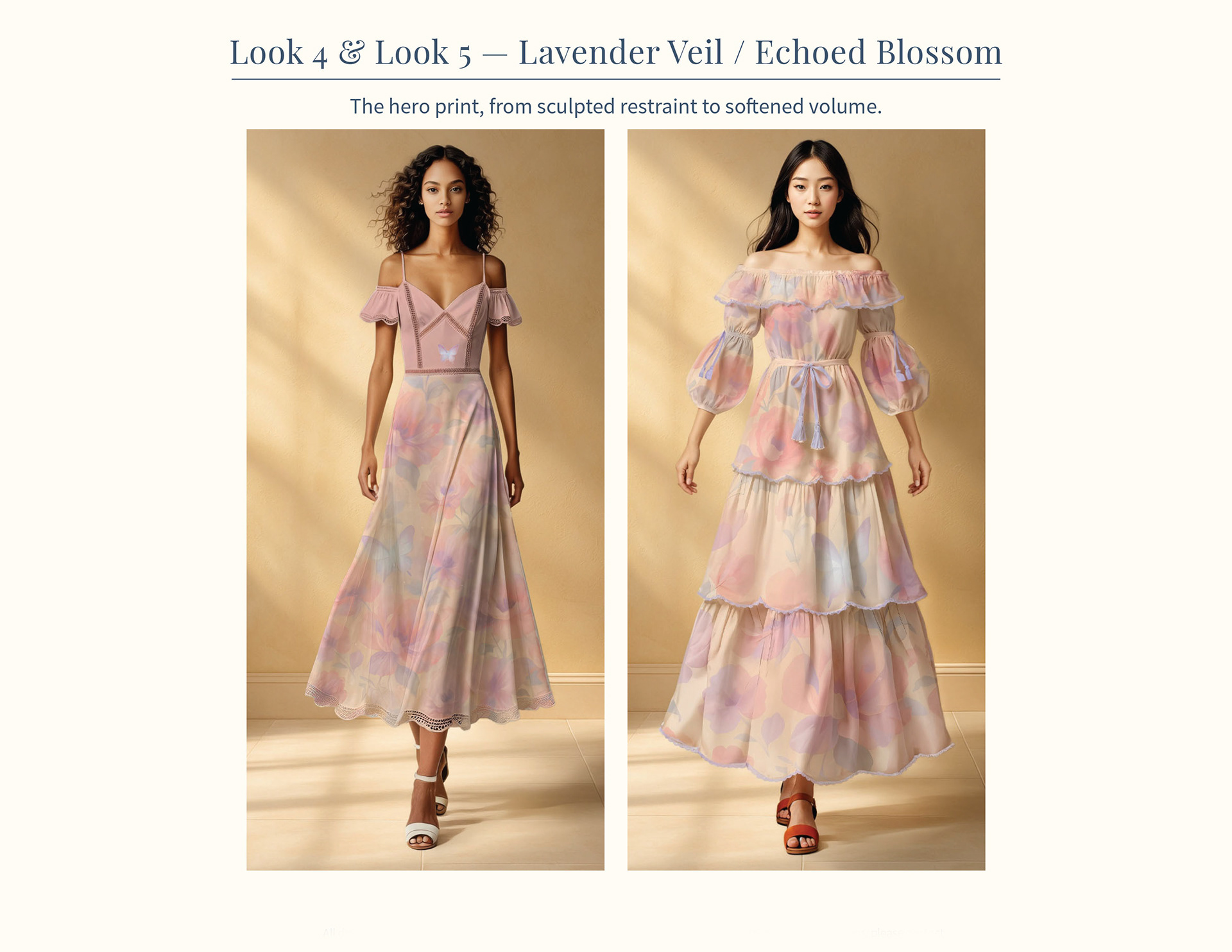 The hero floral evolves from sculpted restraint to softened volume, exploring how print scale and silhouette shift the emotional weight of the same motif.