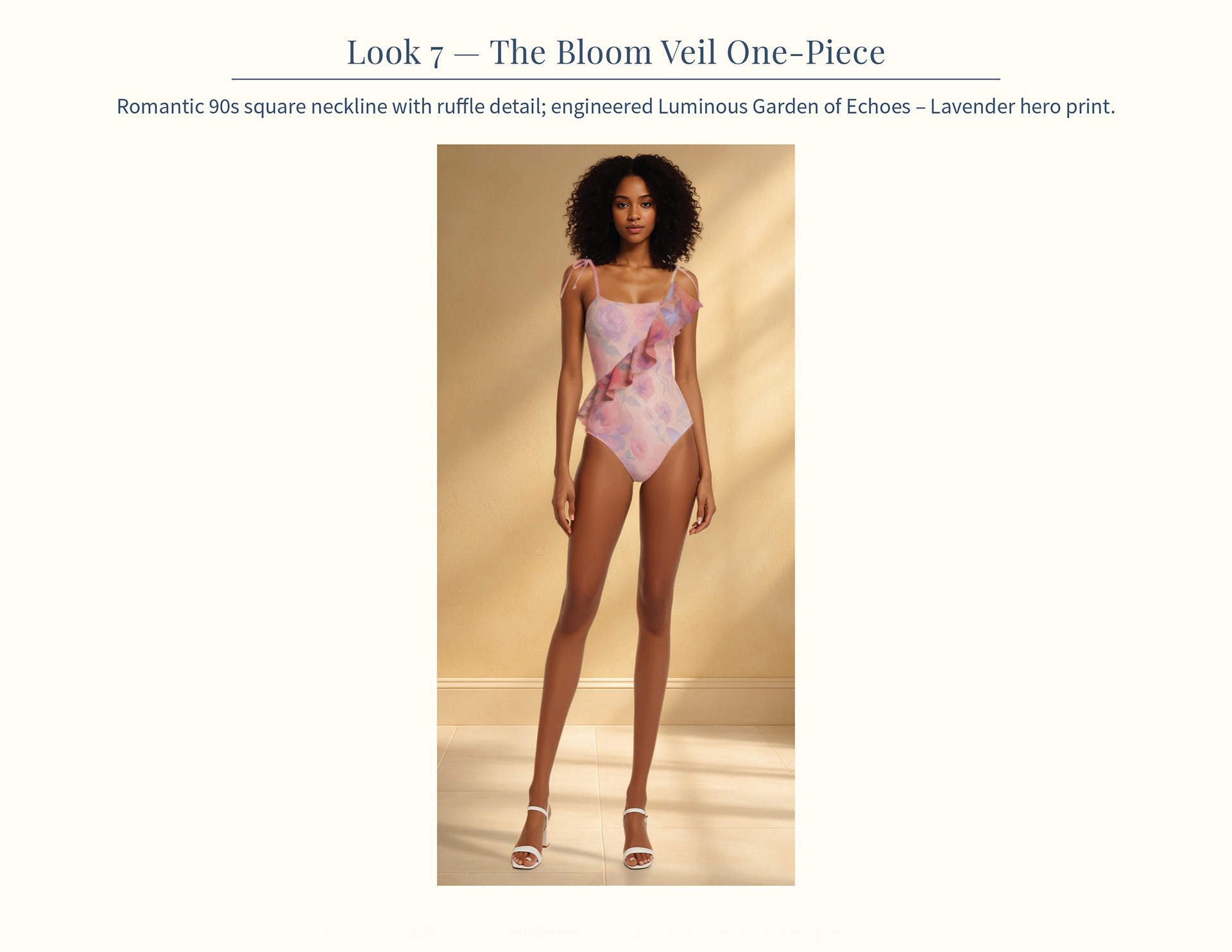 A sculpted 90s-inspired silhouette where engineered print placement and asymmetrical ruffle detailing bring softness into precise form.