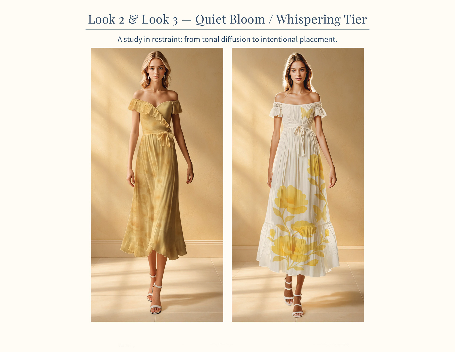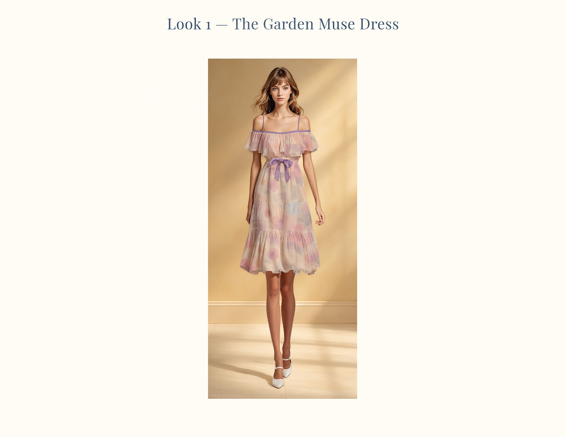 Off-shoulder tiered dress exploring softened proportion and fluid movement, rendered in the Luminous Garden of Echoes floral.