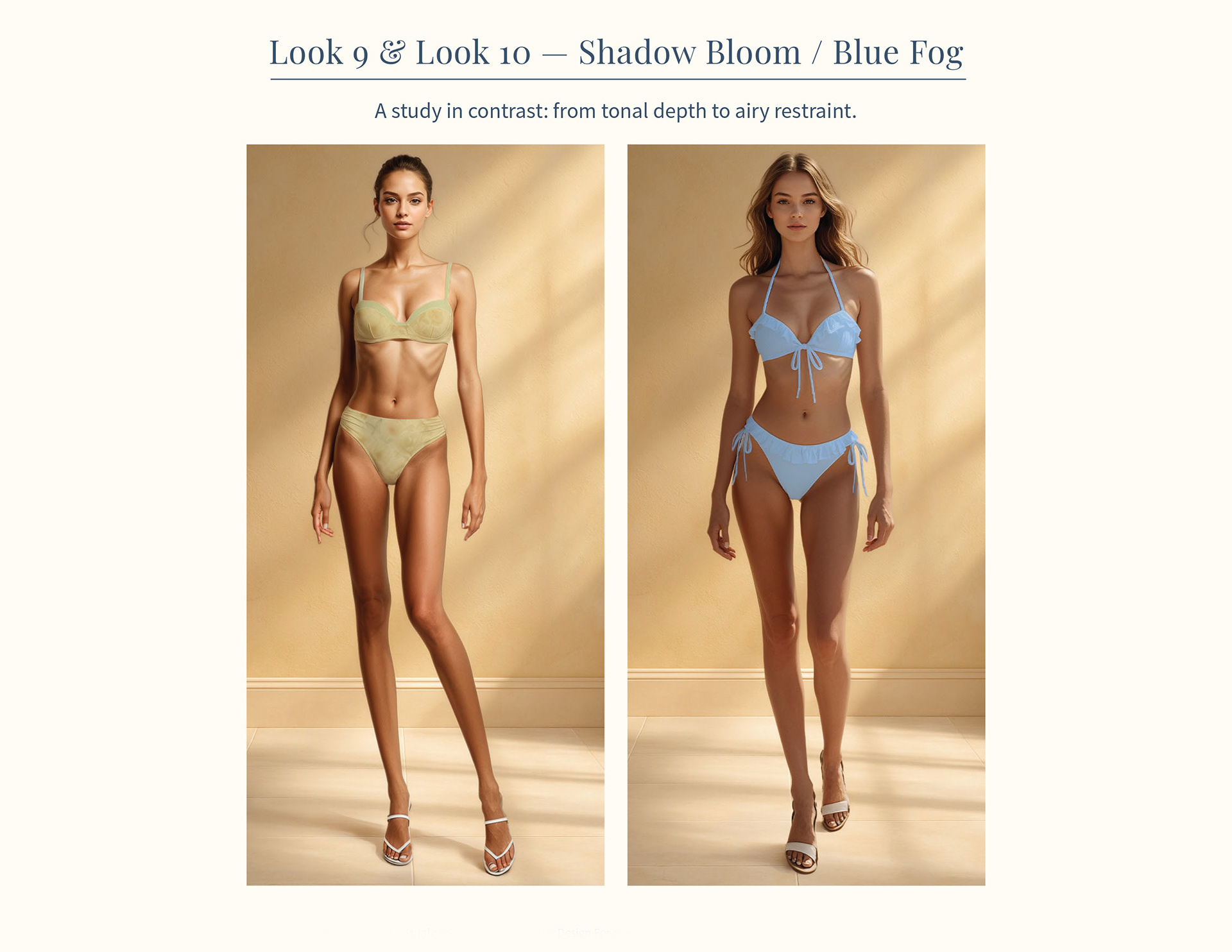 Two expressions of lightness and depth, exploring how tonal saturation and airy color shift the mood of a refined swim silhouette.